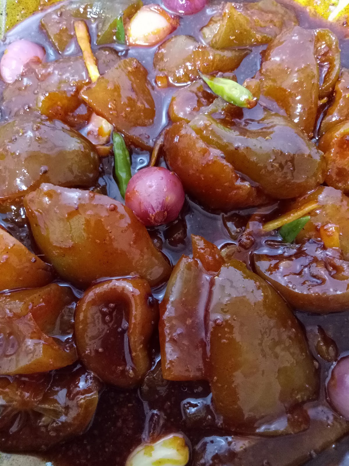 Masukkan asam asam buah limau cili muda kismis lobak masin bawang dan halia. Renihkan perlahan lahan sampai pekat. Sejukkan dulu sebelum memasukkan kesemua bahan bahan lain. Masukkan sos tomato sos cili sos tiram dan kicap manis biarkan mendidih sekejap dan masukkan pula sedikit air.