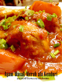 Ayam masak merah kenduri sedap kalau makan mesti nak tambah tapi malu sebab ramai mata yang memandang. Jadi macam ayam sambal. Sesuai sangat nikmati dengan aneka nasi tumis. Dah lama resepi ini disalin cuma belum ada kesempatan dan masa yang sesuai untuk dicuba sendiri sehingga lah hari ini.